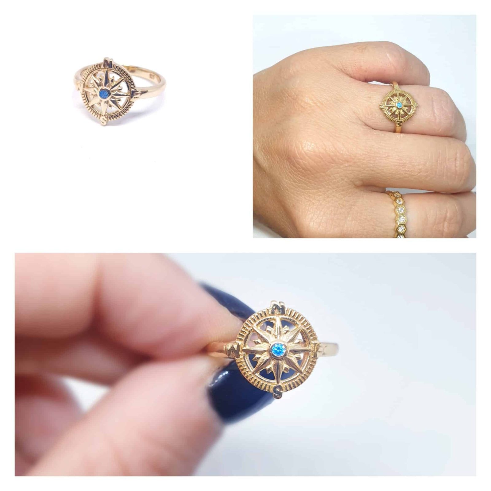 Anillo brújula o rosa de los vientos en plata de ley con baño de oro 14 quilates y piedra pequeña azul central.
