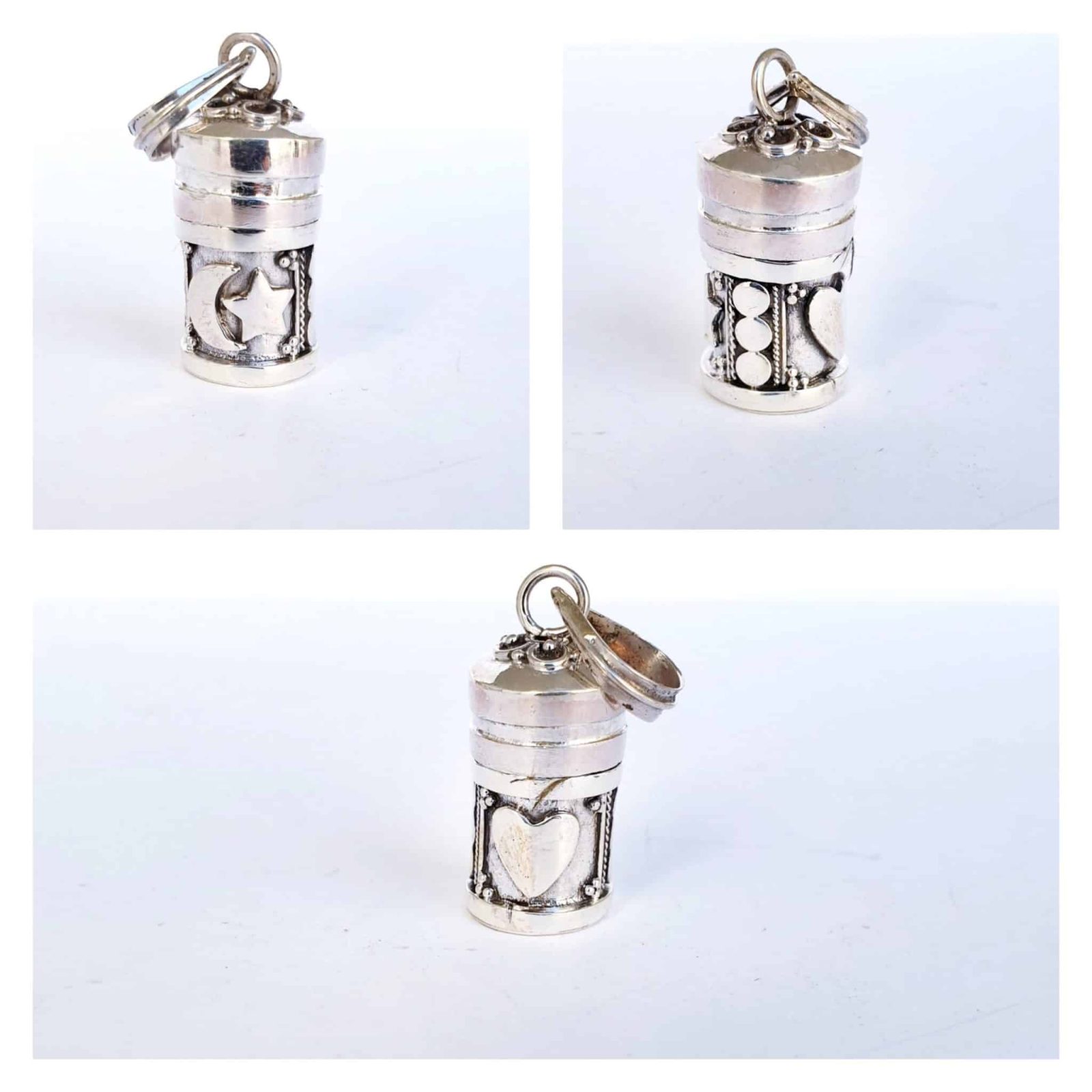 Colgante cofre de los deseos en plata de ley con labrados a mano de luna, estrella y corazón.