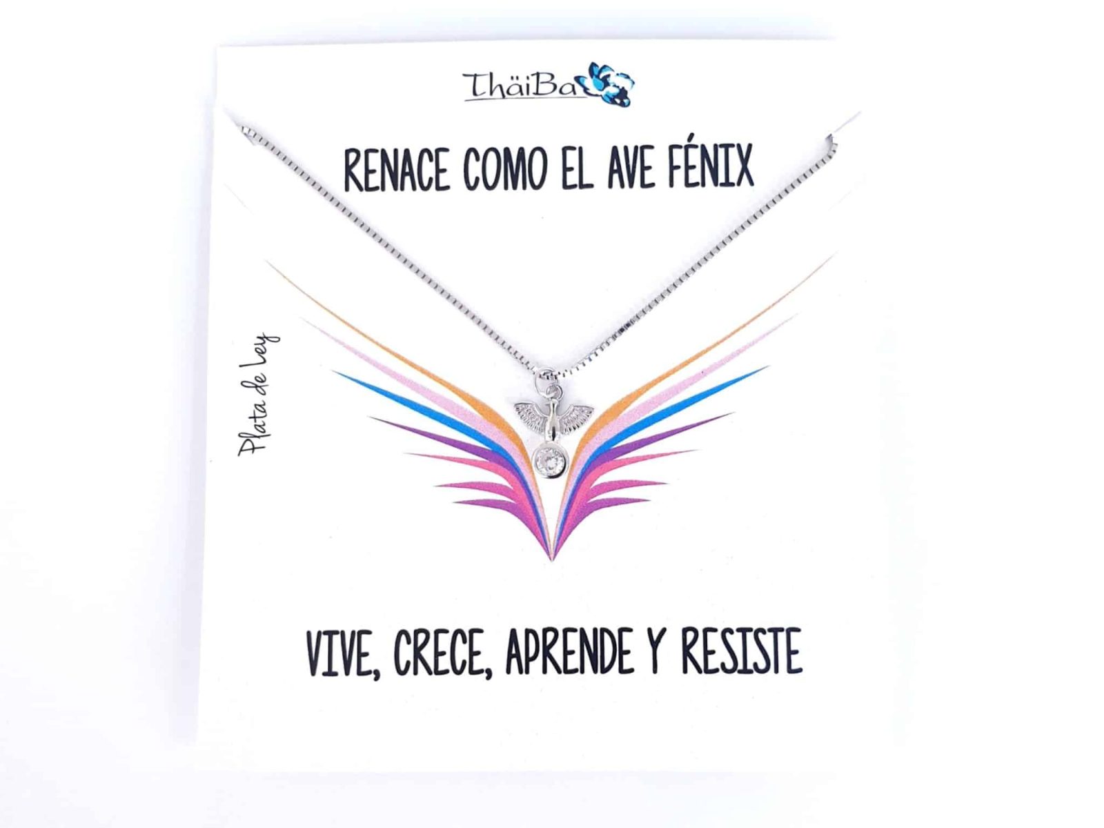 Collar ave fénix en plata de ley cuyo significado es el renacimiento, nuevos caminos y vida nueva.