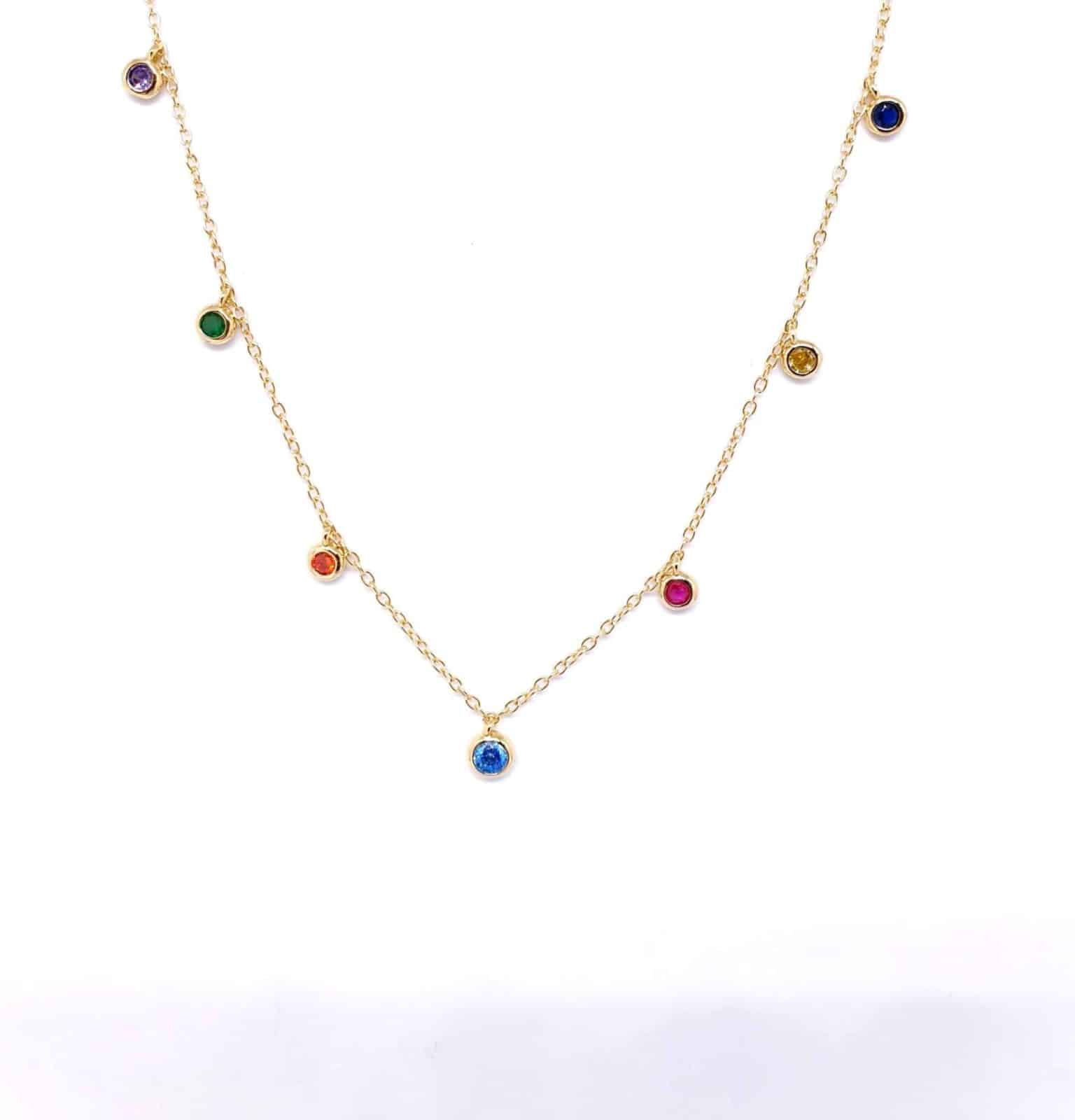 Collar con siete puntos de luz en circonitas de colores. Plata de ley con baño de oro 14 quilates y cadena extensible a tres medidas.