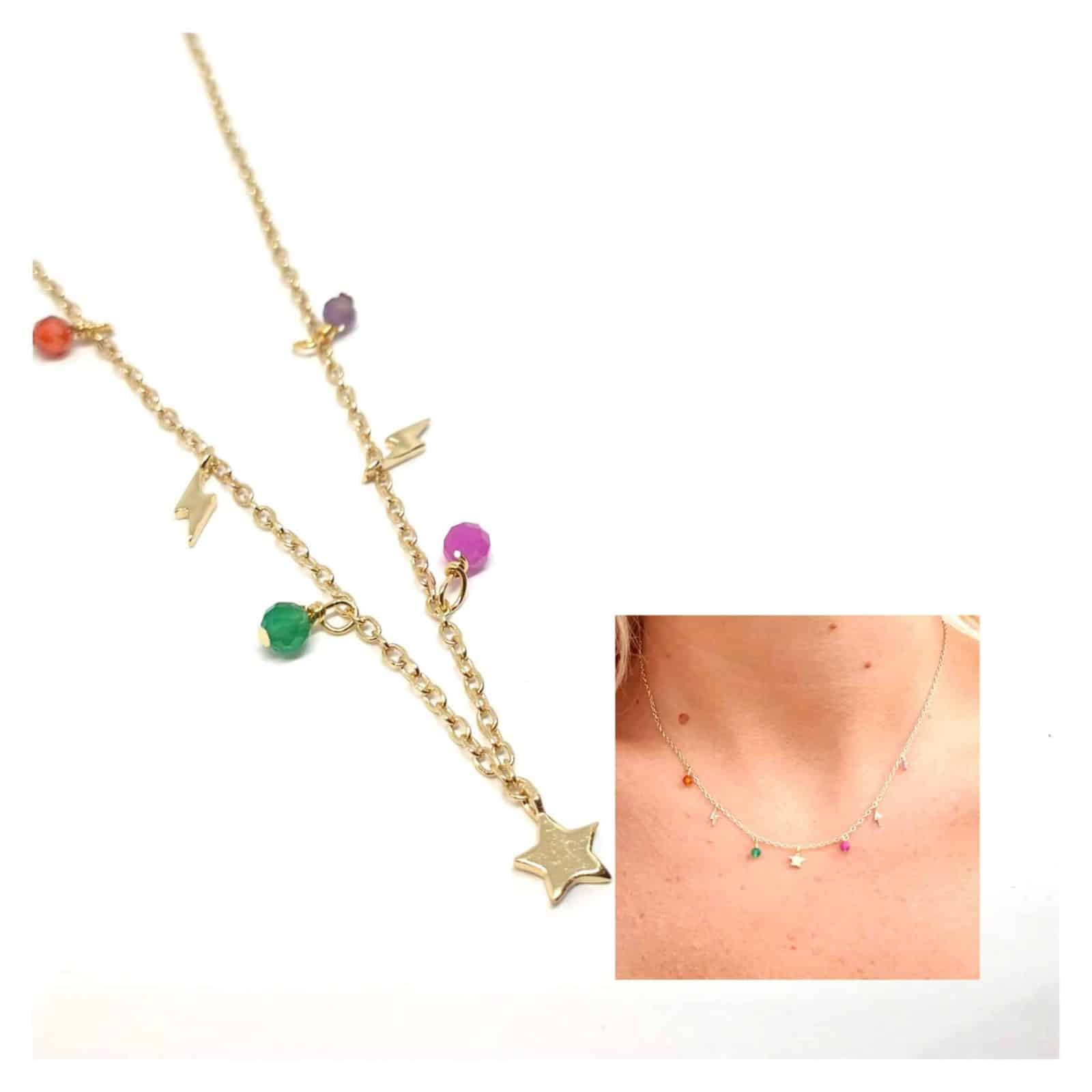 COLLAR BASICO CON BOLITAS DE PIEDRAS DE COLORES Y CHARMS DE RAYOS CON ESTRELLA CENTRAL. PLATA DE LEY CON BAÑO DE ORO. CADENA EXTENSIBLE.