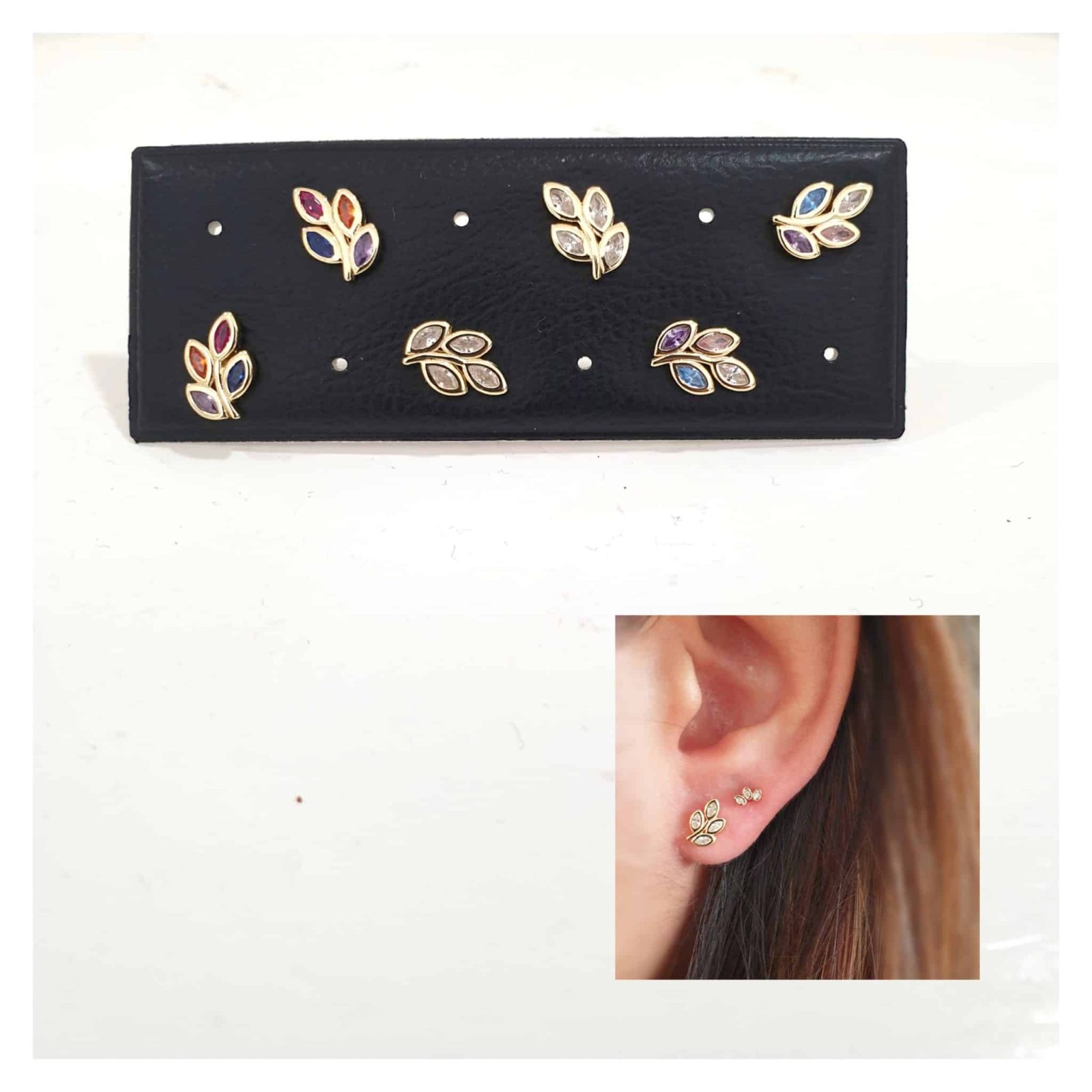 Pendientes hojas de circonitas blancas o colores en plata de ley. Pack de tres pares para profesionales.