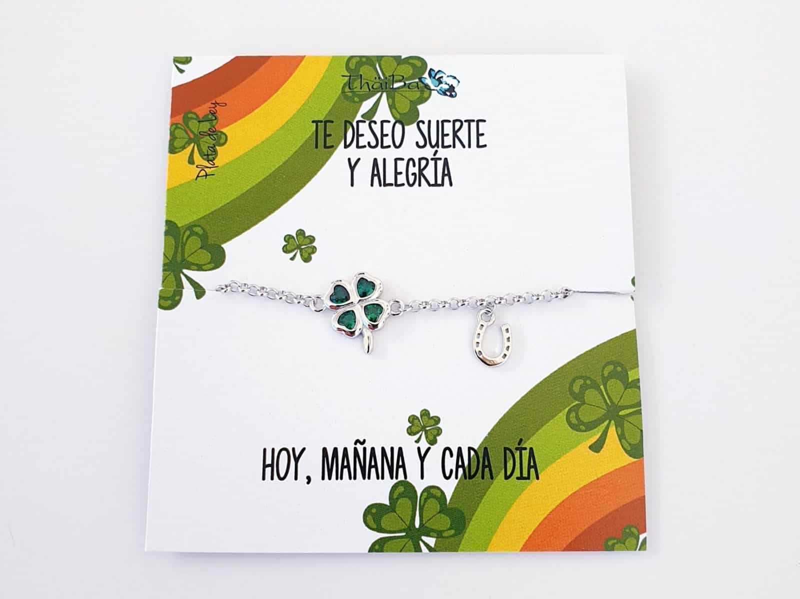 Pulsera de la suerte con trébol en circonitas verdes y charm de herradura, en plata de ley con cadena extensible.